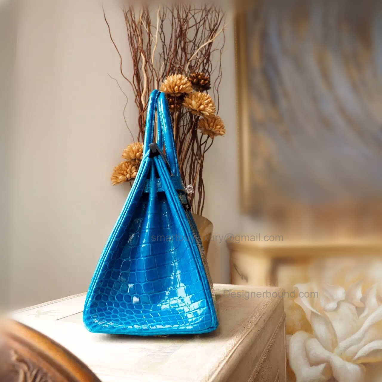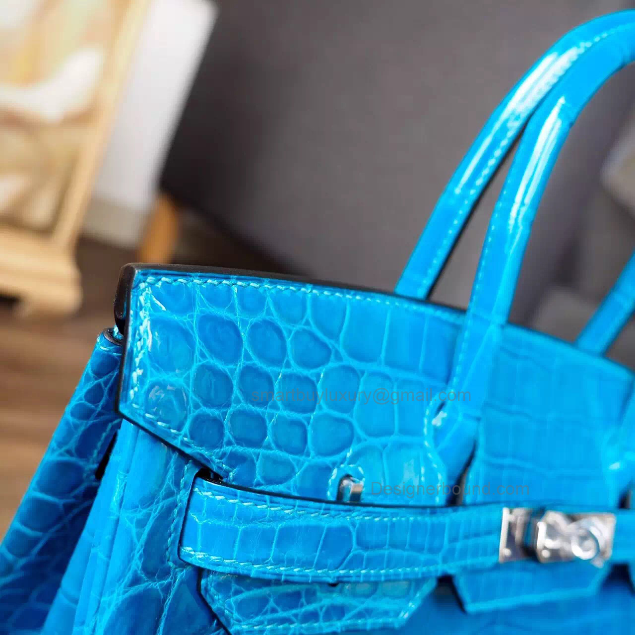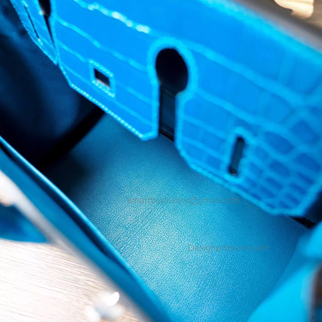 Hand Stitched Hermes Birkin 25 Bag in 7w Blue Izmir Shining Niloticus Croc SHW
