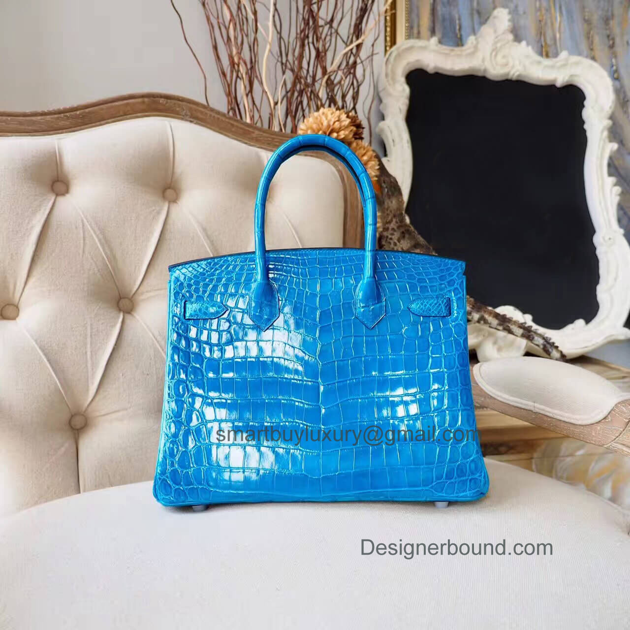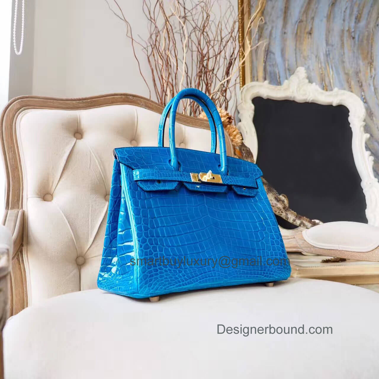 Home  >  SHOP BY DESIGNERS  >  HERMES EXOTIC > Hermes Birkin 30 Bag in 7w Blue Izmir Shiny Nile Croc GHW